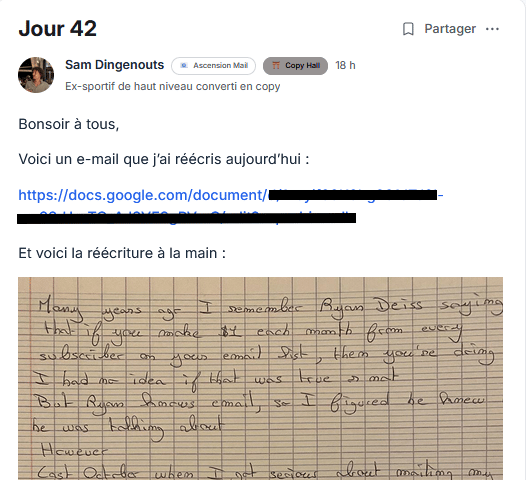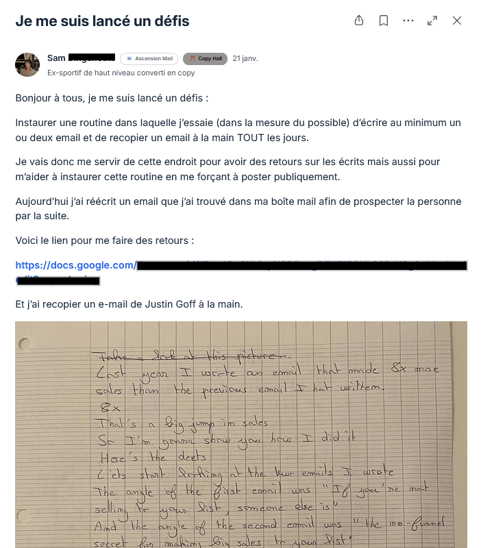 Car il a récemment signé une mission à 2000€ avec un client, qu’il a réalisée avec l’aide d’un Copy Chief au sein du mastermind afin de rendre un travail très qualitatif.